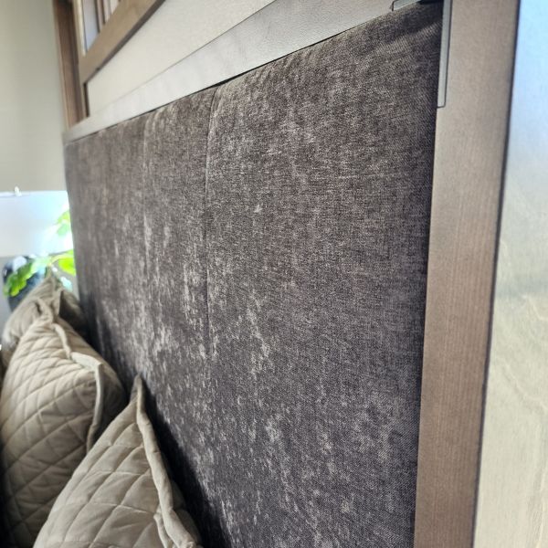 Custom-designed bedroom furniture with high-end contemporary style. Atmosphere style king bed upholstered in 107 Oxford fabric on Smoke-stained Solid Birch...