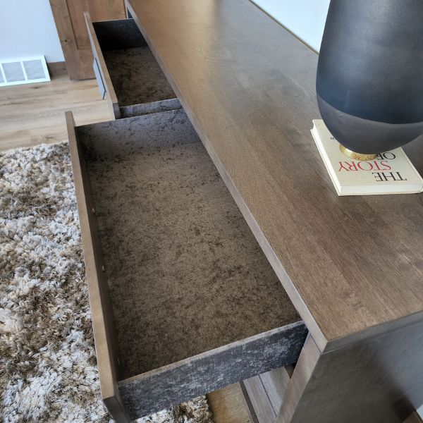 Brown Lacquered Mango Wood with a soft-close storage drawer and plinth base. Wood is full of character, grain, number and...