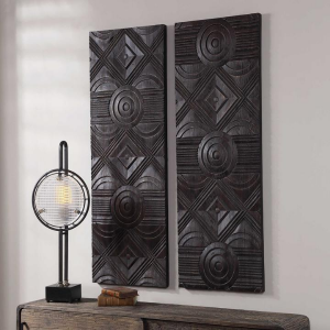 This intricately carved wooden panel provides a tribal accent, showcasing deep wood grains finished in a dark walnut stain and...