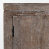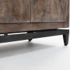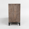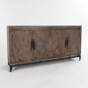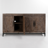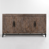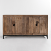 A mid century modern silhouette, plus rustic wood and iron use this exciting and versatile piece as a media console or storage credenza.