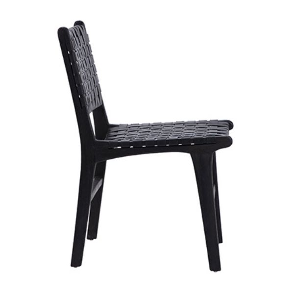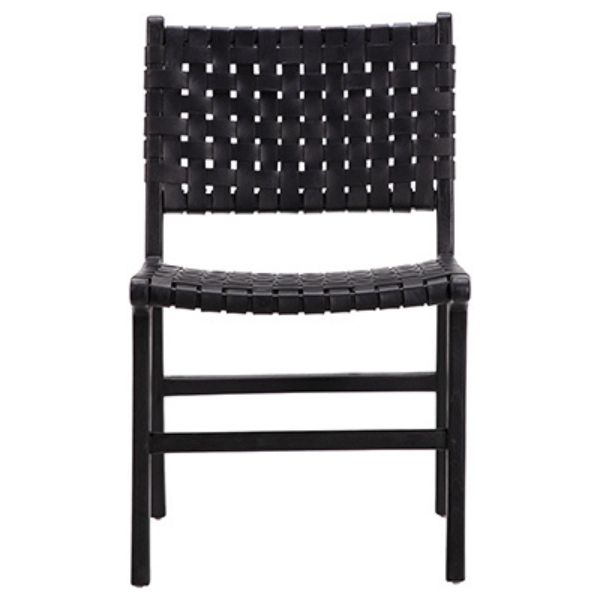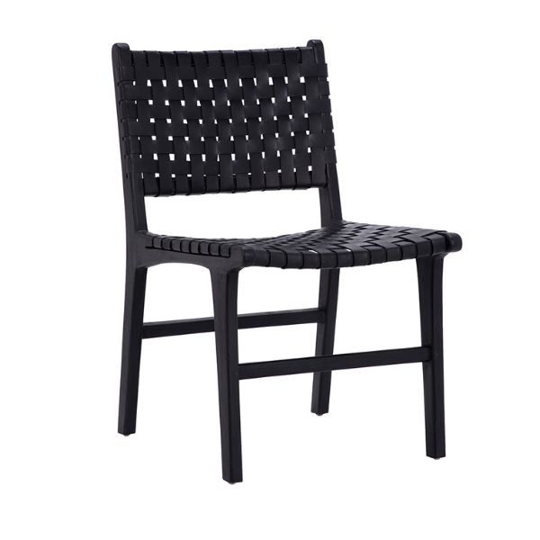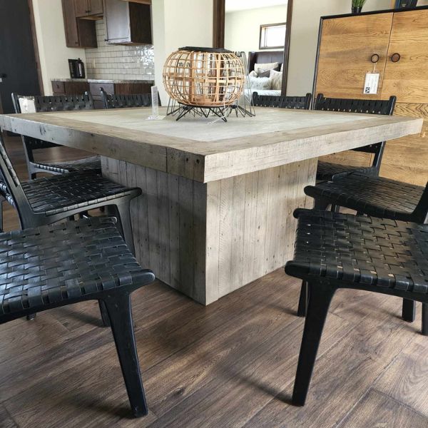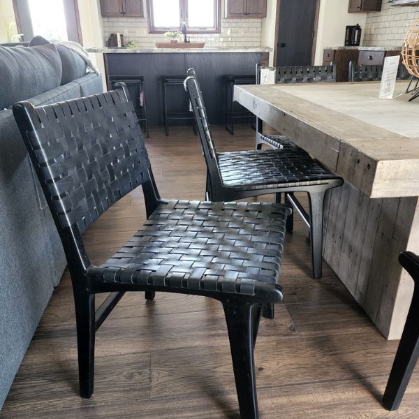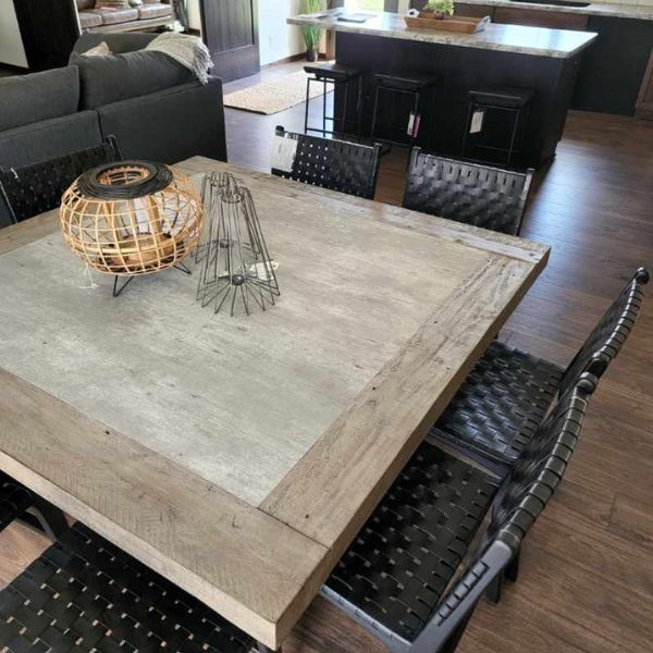 A thoughtfully curated dining set by our very own designers pairs a modern yet soft looking 60” square dining table with 8 leather-woven side chairs in an antique black finish.