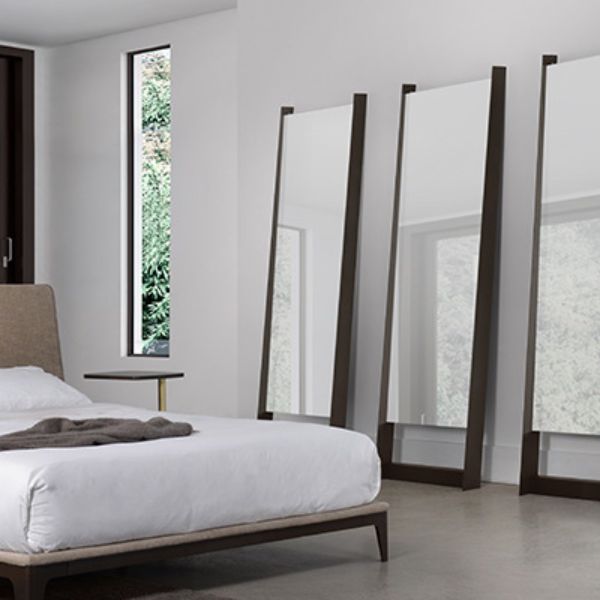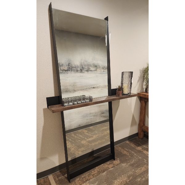 A tall leaning mirror intersected by a wood shelf. Image is not reflective of stock piece. Stock piece has Dark Gray Finish on Mirror with a Smoke Birch Wood Shelf.
