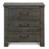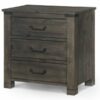 Casual living is interpreted in handsome shapes in this two-drawer nightstand. A rustic Weathered Charcoal finish over pine solids is accented by Aged Iron Metal hardware, creating its hospitable allure. Rustic enough for a loft or retreat yet sophisticated enough for the uptown industrialist.