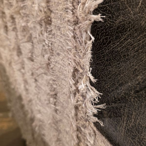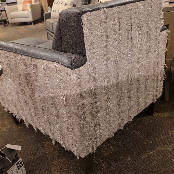 A tailored club chair with impressive detail on the inside seat back finished in a two-tone design with a fringed neutral fabric on the outside and a faux black leather on the inside.