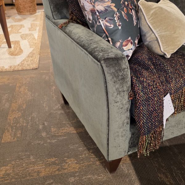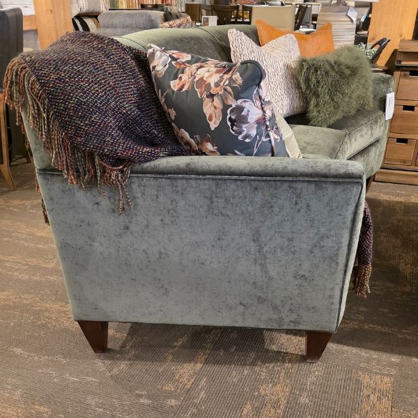 A custom-designed sofa with 3-over-3 cushions curved in a conversation style finished in a velvet green fabric.