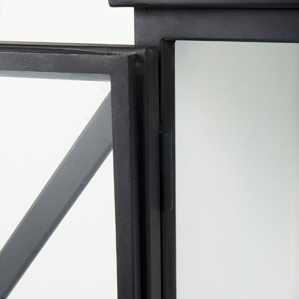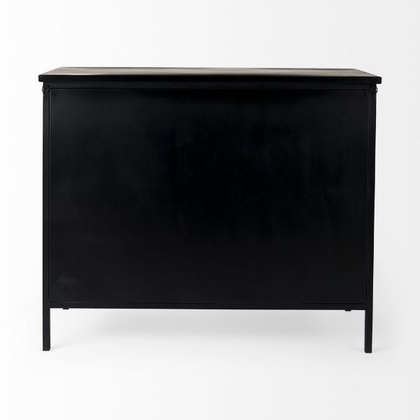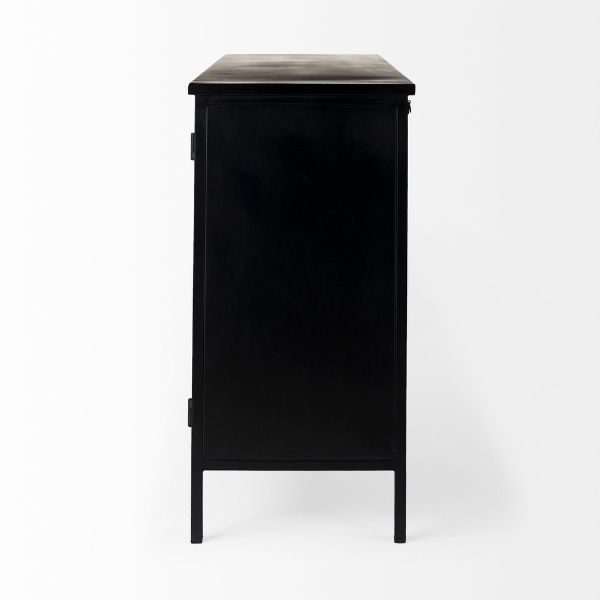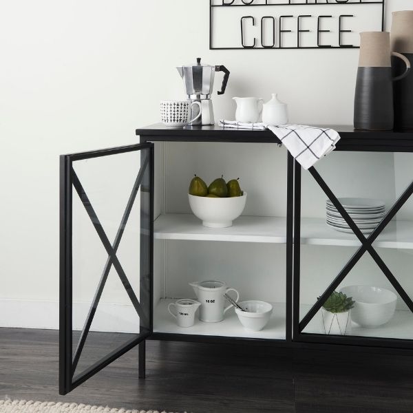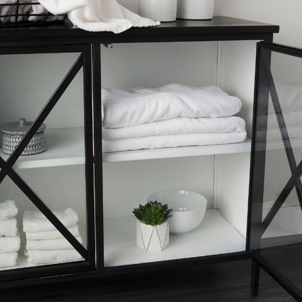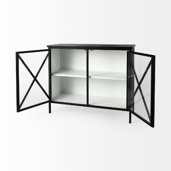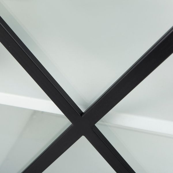 This two-door accent cabinet features a sturdy iron structure finished with double glass doors overlaid by simple crisscross metal detail. It has an airy aesthetic, standing off the floor on four slender, straight legs.