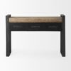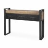 The stylish, engineered pine wood top is braced by a unique, rustic metal frame that stabilizes the table and ensures that your decor items are securely displayed. This prudently designed console table provides ample storage space for media accessories, magazines, and everyday carry items, thanks to the wooden drawers fitted with cast iron pull-handles. The wooden top is also large enough to host a variety of your favorite decor items. stunning, console table with a metallic frame that holds a wooden top and three storage drawers.