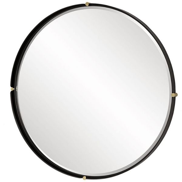 This large round mirror showcases a strap style iron frame finished in a sleek matte black with soft curved ends that encompass antique gold column medallions. The floating style mirror has a generous 1 1/4″ bevel.