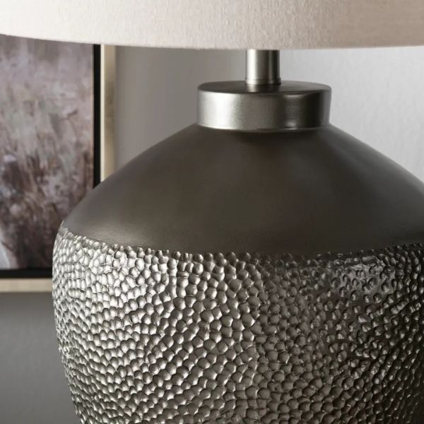 A dimpled resin dark charcoal-colored table lamp.