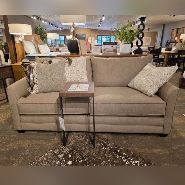 Two cushion sofa with loose-back seat cushions in a neutral taupe color.