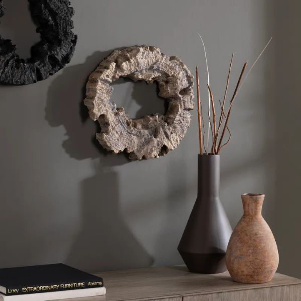 Circular Wood Pieces framed in a Textured Black Frame with Cream backdrop