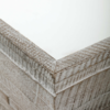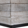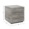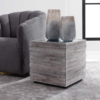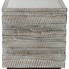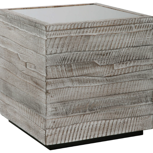 This casual rustic cube table features a pieced fir wood construction with natural distress and chatter marks, layered in a whitewashed finish with honey undertones on a floating pedestal base. Complete with a beveled mirrored top.