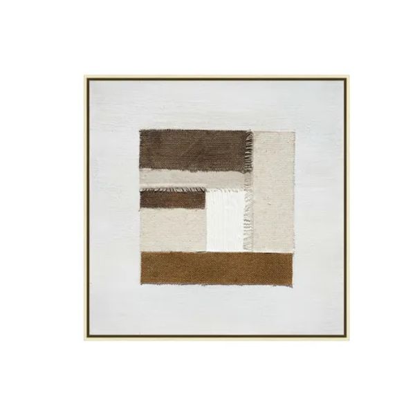 Featuring serene white background adorned with various fabric swatches that introduce rich textures to the artwork. The color palette of brown, taupe, and white harmonizes with the textures and is elegantly framed in gold.